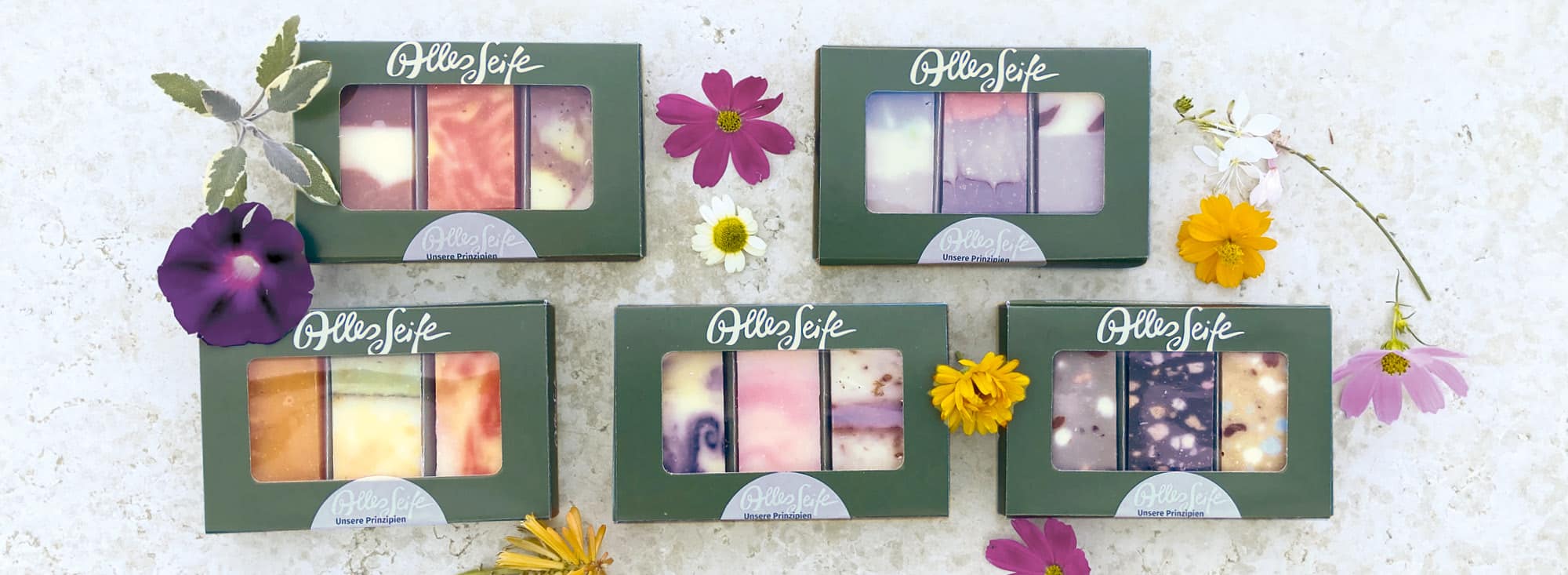 Die erlesenen Trios werden mit jeweils drei unserer handgesiedeten Naturseifen in hübsche Sichtkarton verpackt. Je nach Saison gibt es erfrischende, blumige, sonnige, winterlich-wärmende oder würzig-herbe Dreierkombinationen zum Verschenken oder Selbstbehalten.
