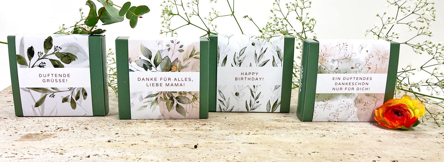 Mit unseren Geschenkboxen könnt ihr eure Lieblings-Naturseife mit eurer ganz persönlichen Botschaft versehen und verschenken. Wähle aus vielen verschiedenen Aufschriften wie „Danke für Alles!“, „Papa, du bist der Beste!“ oder „Liebe Ostergrüße!“ die passende Banderole, suche dir deine Wunschseife dazu aus und wir geben dann die jeweilige Naturseife (120 g) in eine hübsche Kartonbox und versehen diese mit der wunderschönen Banderole, die du ausgewählt hast.